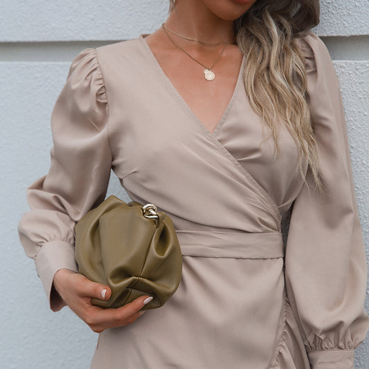 Autumn New Solid Color And V-neck High Waist With Straps Irregular Long Sleeve Women's Dress