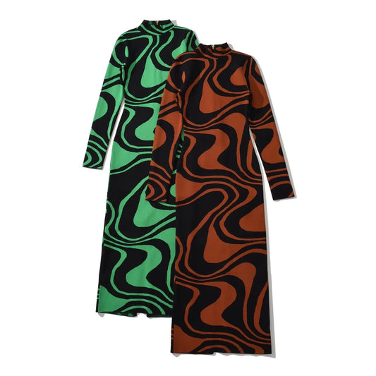 Back Zipper High Collar Abstract Jacquard Knitted Dress For Women