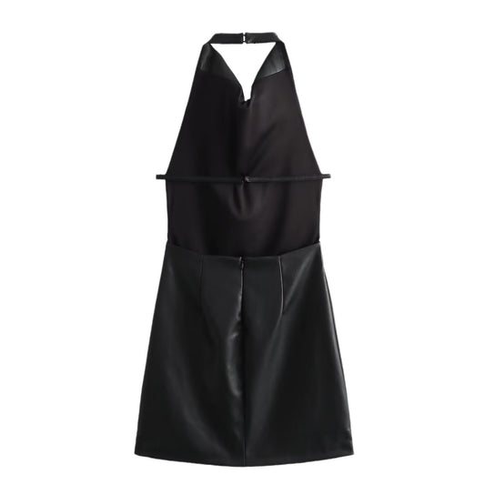 Autumn Female Halter Backless Solid Color Pu Leather Dress