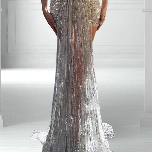 Women's Off-shoulder Trailing Silver Paillette Evening Dress