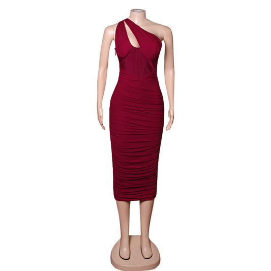 Women's Clothing Skinny Mesh Slant Shoulder Hollow Dress
