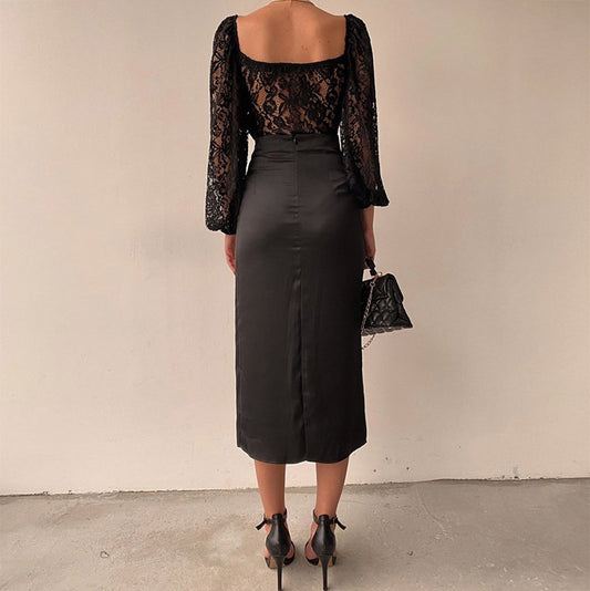 Black Fashion Slim Fit Sexy Lace Split V-neck Dress