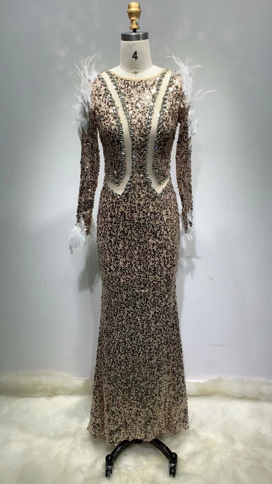New Women's Beaded Tight Feather Long Jumpsuit Dress