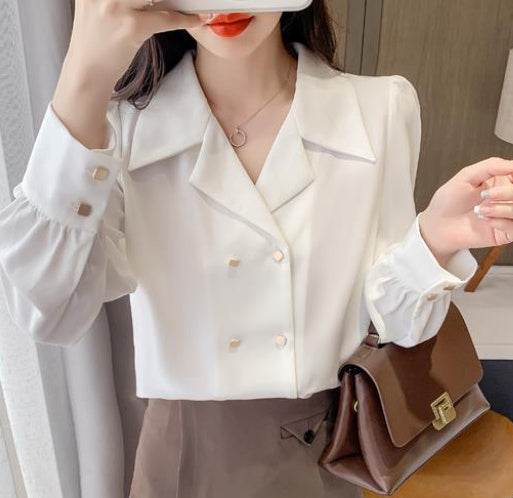 Temperament Double-breasted Puffy Sleeve Professional Shirt Vintage Hong Kong Style Top