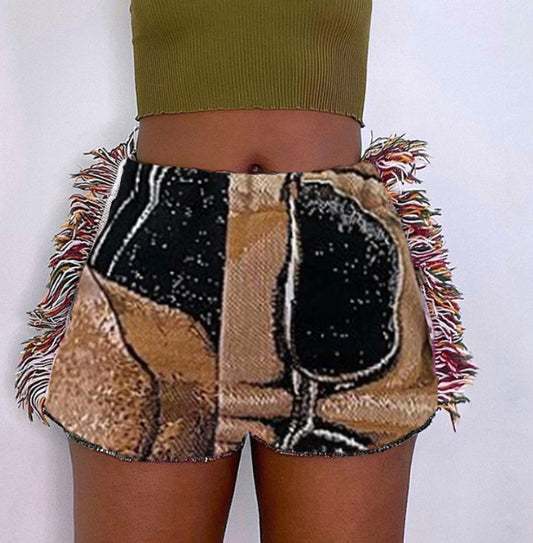 Printed Tassel Bag Hip Ethnic Style Tweed Casual Shorts