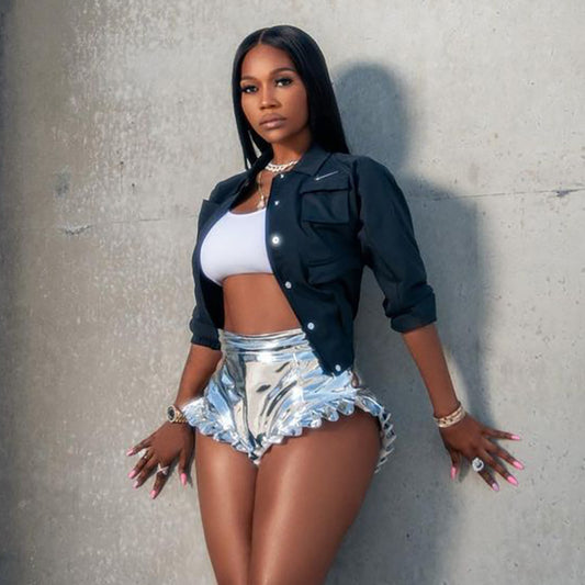 Women's Fashion Contrast Color Faux Leather Lace Up High Waist Pack Hip Tight Casual Shorts