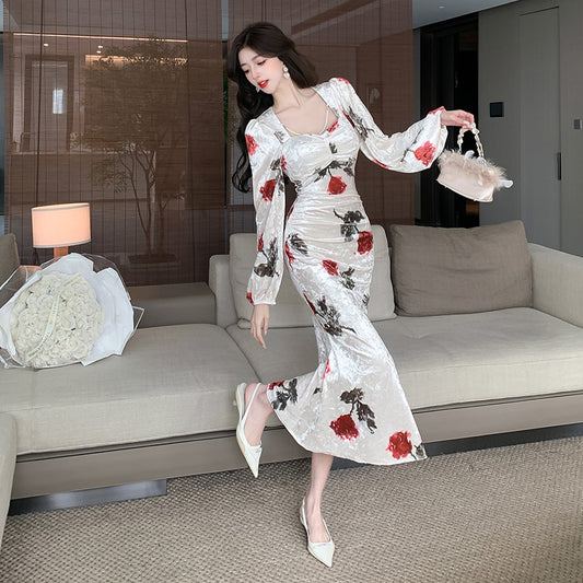 Autumn New Fashionable French Long Neck Round Waist Fold Light Luxury Style Dress