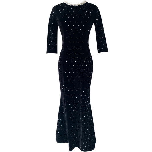 Women's Three-quarter Sleeve Beaded Light Diamond Long Dress