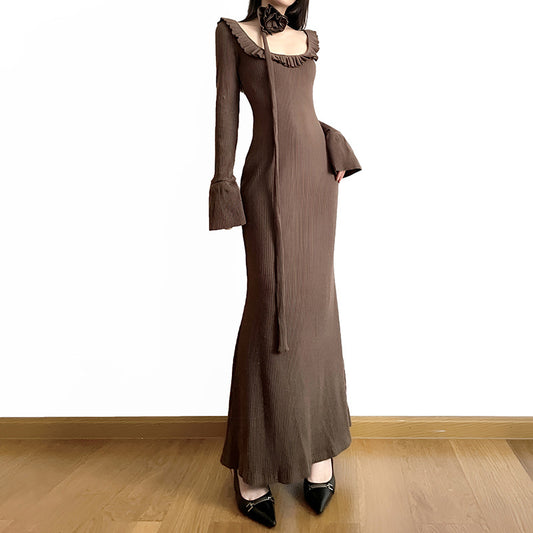 Waste Soil Style Ruffled Slim-fit Long Sleeve Dress