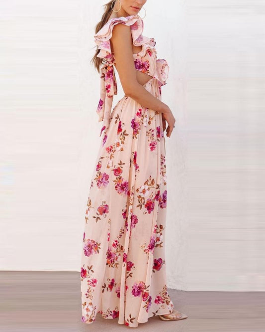 Double V-neck Sleeveless Slit Printed Long Sling Dress