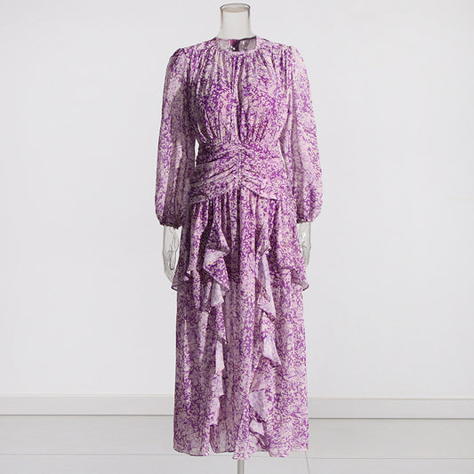 French Retro Sweet Style Women's Long Sleeve Mid Waist Pleated Print Dress