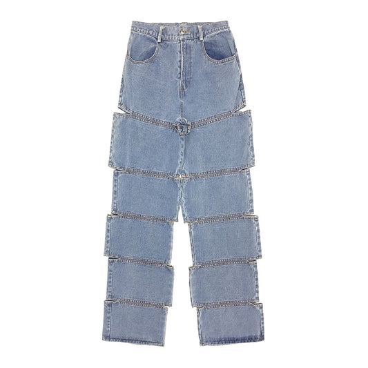 New Style Women's Casual Pierced Drawnwork High Waist Bootcut Washed Jeans
