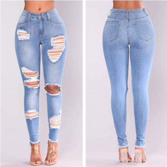 Sexy Pencil Ripped Jeans For Women Summer Fashion All-Match Elastic High Waist Washed Holes Denim