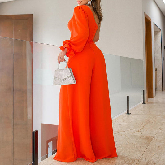 Women's Fashionable Temperament Diagonal Collar Petal Sleeve Casual Loose Wide Leg Jumpsuit