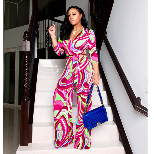 Women's V-Neck Long Sleeve Print Jumpsuit