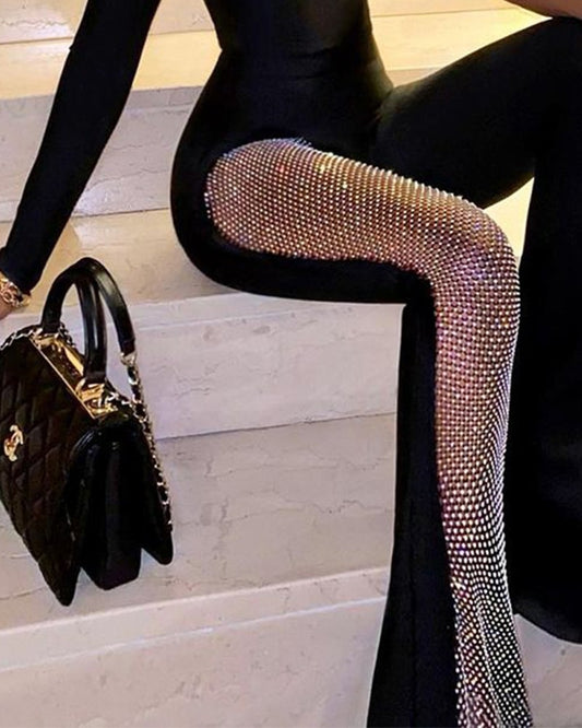 Sexy One Shoulder Diamond Net Waist Slim Fit Micro Flare Jumpsuit