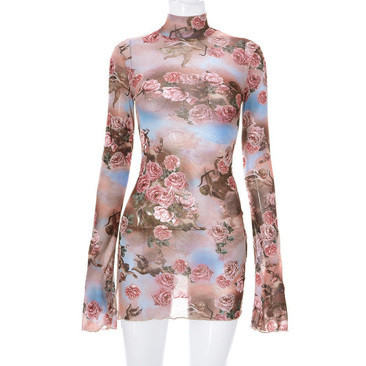 Round Collar Gauze See-through Printed Long Sleeve Dress