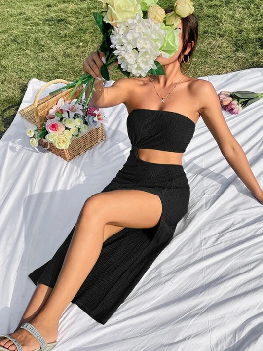 Solid Color Slim Temperament Sloping Shoulder Backless Split Dress