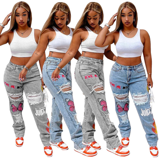 Women's Digital Positioning Print Ripped Fashion Jeans