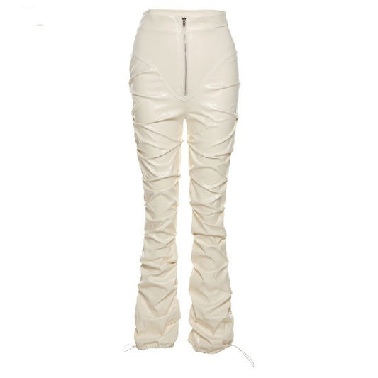 High-waist Straight Tube Wide Leg Bandage Slim Leather Casual Pants