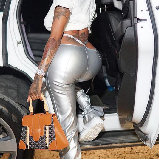 High Waist Fashion Elastic Pants PU Silver Leather Pants Lace-up Ankle-tied