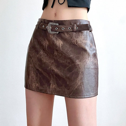 Women's Fashion Brown Vintage Tie-dye Leather Skirt