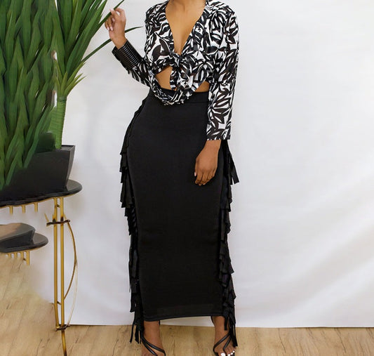 Casual High Waist Pleated Mid-length Fringed Skirt