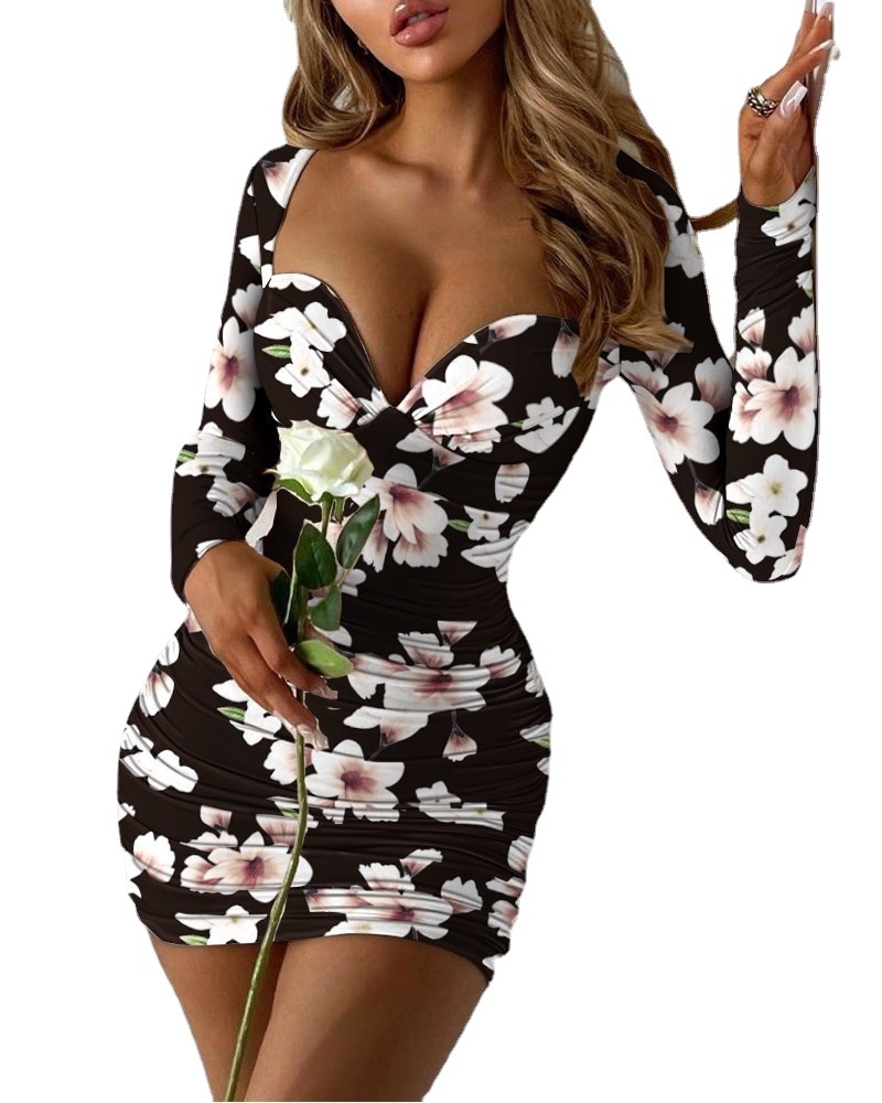 Long-sleeved Square Neck Sexy Low-cut Slim-fit Buttocks Printed Dress