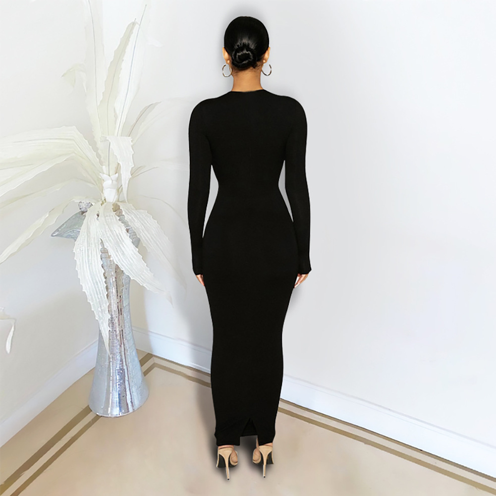 Pure Color Temperament Commuter Wrapped Chest Long Sleeve Midi Dress