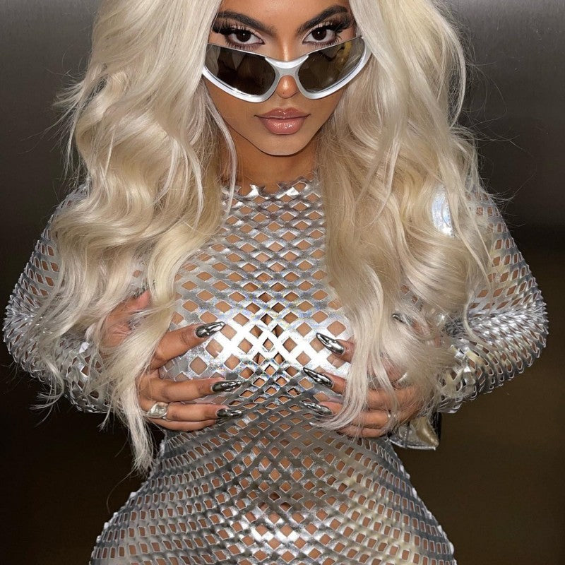 Solid Color Round Neck Hollow-out Long Sleeve Glossy Slim Fit Dress