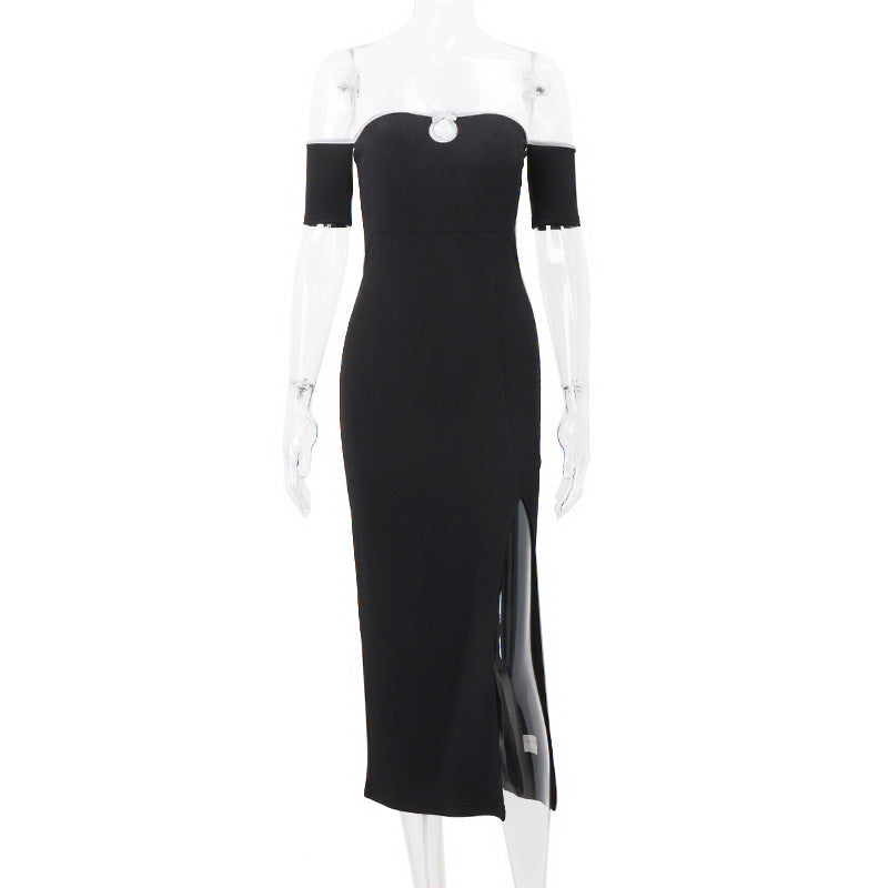 Summer New Fashion Off-neck Tube Top Hollow High Waist Split Short Sleeve Long Dress