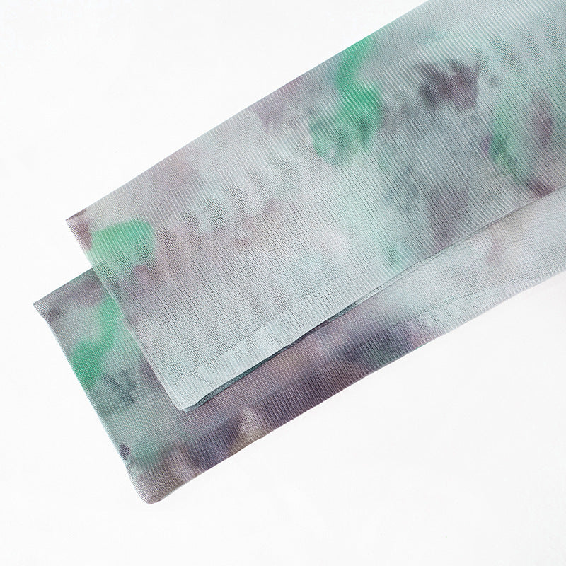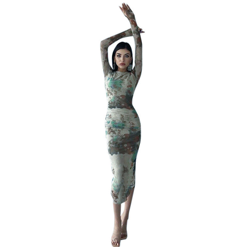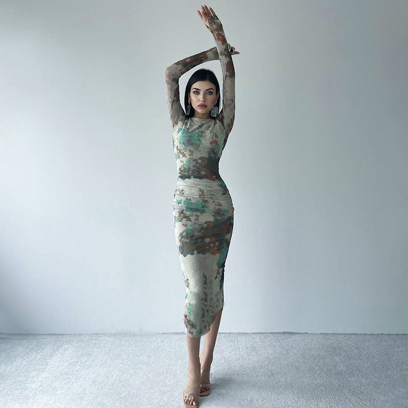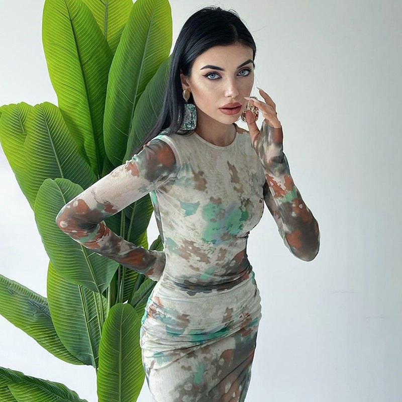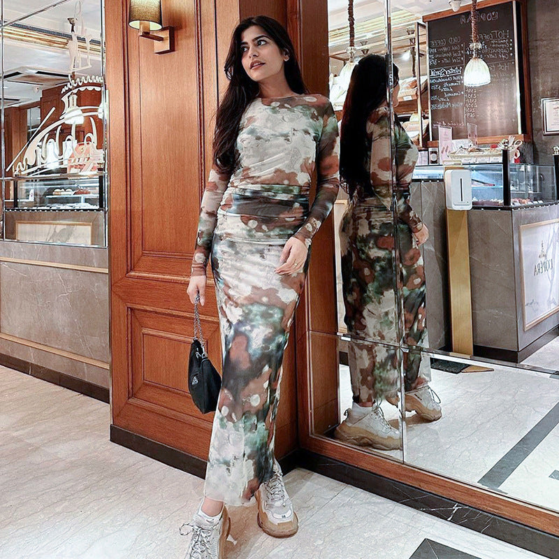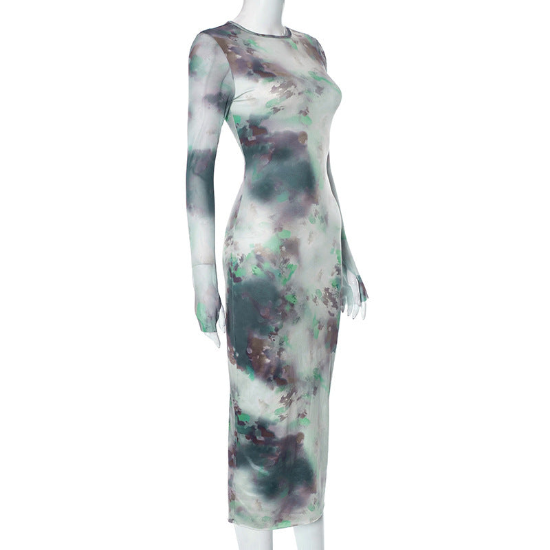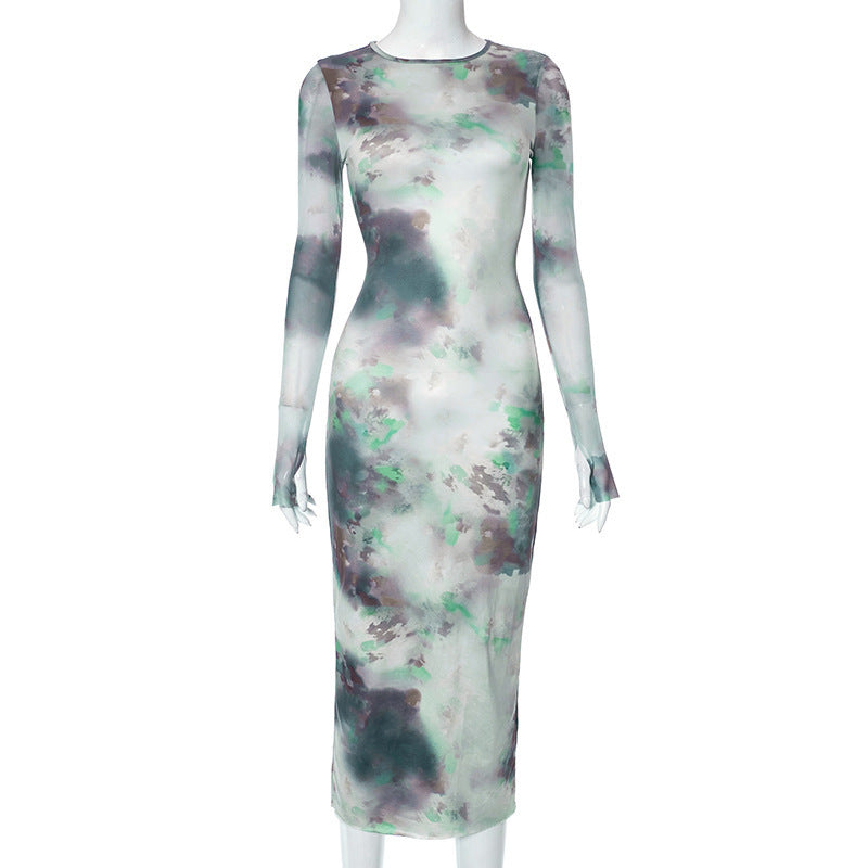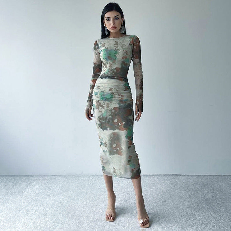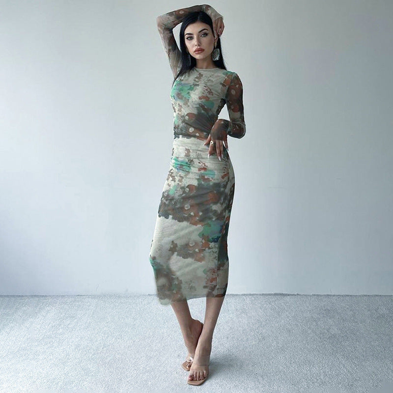 Women's Clothing Autumn New Casual Printed Finger Stall Long Sleeve Round Neck Stitching Mesh Length Dress