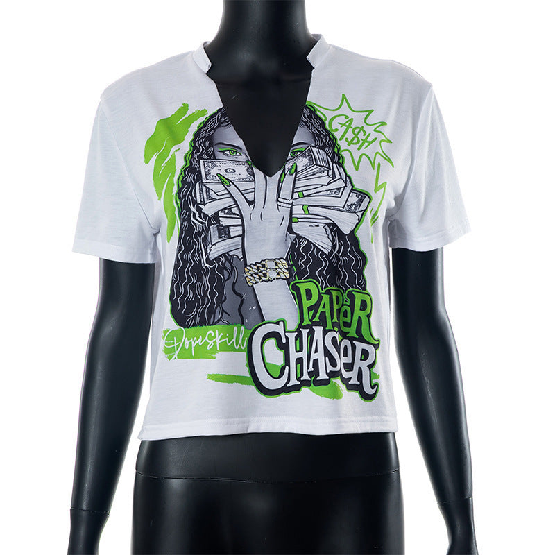 Women's Sexy Deep V Printed Short-sleeved Cropped T-shirt